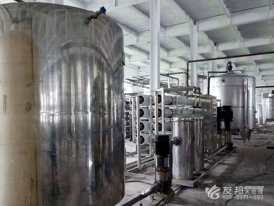 原水→原水加壓泵→多介質過濾器→活性炭過濾器→加藥裝置→精密過濾器→第一級反滲透 →PH調節→中間水箱→第二級反滲透→中間水箱→中間水泵→EDI系統→微孔過濾器→用水點