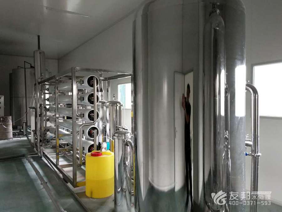 地下水或自來水——原水增壓泵——石英砂過濾器——活性炭過濾器——加藥裝置——精密過濾器——一級高壓泵——一級反滲透——二級高壓泵——二級反滲透——水箱——成品水